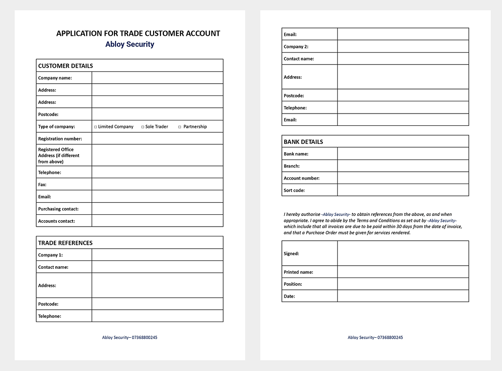At Abloy Security, we value strong and trustworthy relationships with our trade customers. To offer you the convenience of credit terms, we require some essential details to assess your creditworthiness.
